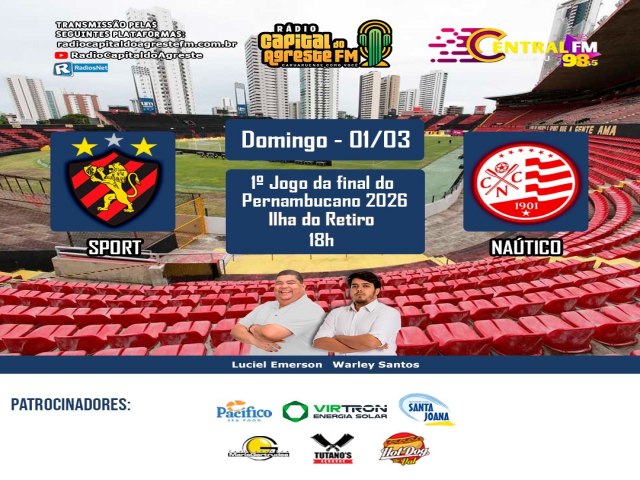 Neste domingo (01° de março), o Sport recebe o Náutico pelo jogo de ida da final do Pernambucano 2026 e você vai acompanhar todas as emoções com a Equipe Giro dos Esportes, Rádios Capital do Agreste; Central FM 98,5. A partir das 17h30, teremos a jornada esportiva em nossas plataformas.